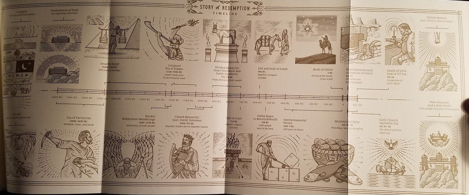- One feature I truly like is the simple "Story of Redemption Timeline" as the very last layout....a four-page spread! It's not too complex, but allows the reader to get a simpler glance to the Bible's history in a single layout.
